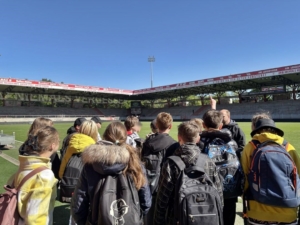 Wir durften in die Kabine der Schiedsrichter gehen und den Spielertunnel sehen. Im Stadion gingen wir dicht an den Rasen. Dann waren wir an den Tribünen. Wir waren auch an der Stelle, wo die Namen der Stadionbauer hingen. Es wurde uns erzählt, dass das Stadion im Sommer 2026 umgebaut wird.